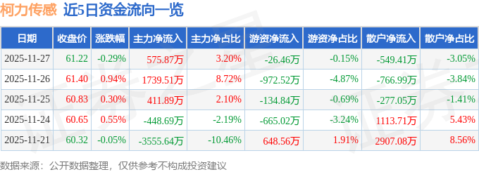 证券之星音讯,到2025年11月27日收盘,柯力传感(603662)报收于61.22元,跌落0.29%,换手率1.04%,成交量2.92万手,成交额1.8亿元。